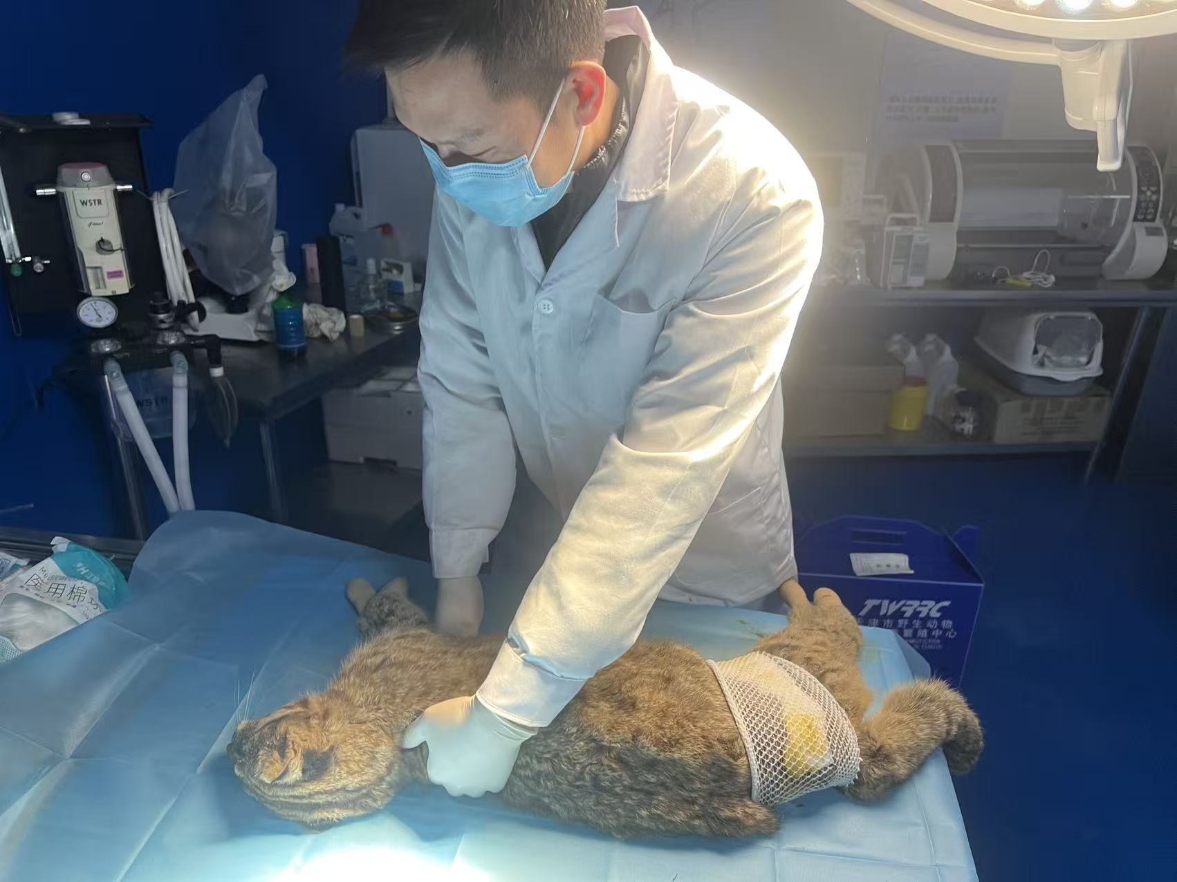 区林业局野保站接报后,迅速联动专业救护机构,组建救援专班携带断线钳、动物保定器等设备火速驰援。在多方协同下,救援人员科学制定方案,仅用20分钟便安全解救豹猫。经专业检查,该成年雄性豹猫体重9.25公斤,存在足部磨损、指甲断裂、腹部伤口等情况,无重大健康风险,目前在救护站点接受专业救治,体态特征稳定,痊愈后将择机放归自然。